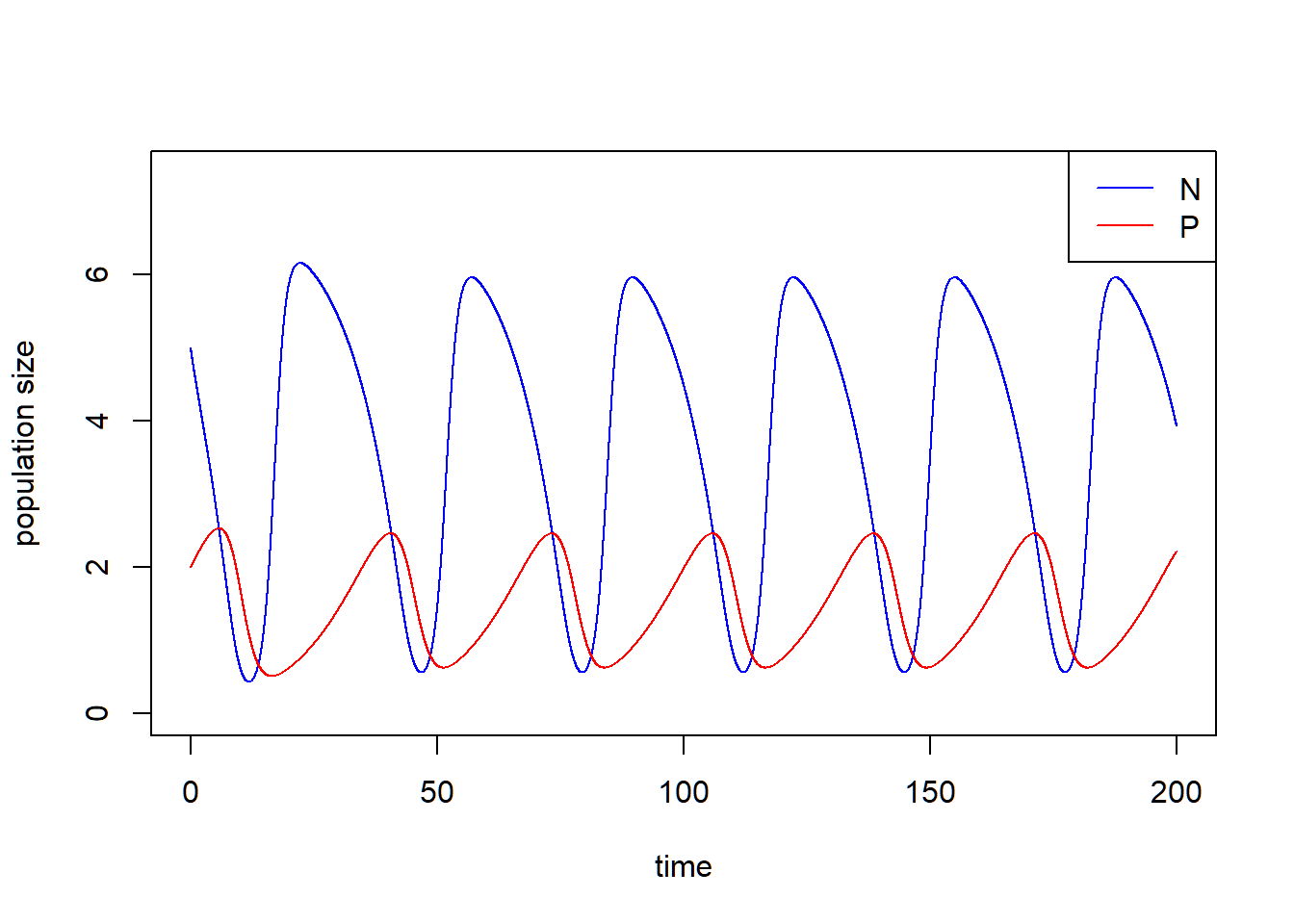 plot(c(0, max(times)), c(0, max(pop_size[, c("N", "P")])*1.2), type = "n", xlab = "time", ylab = "population size")