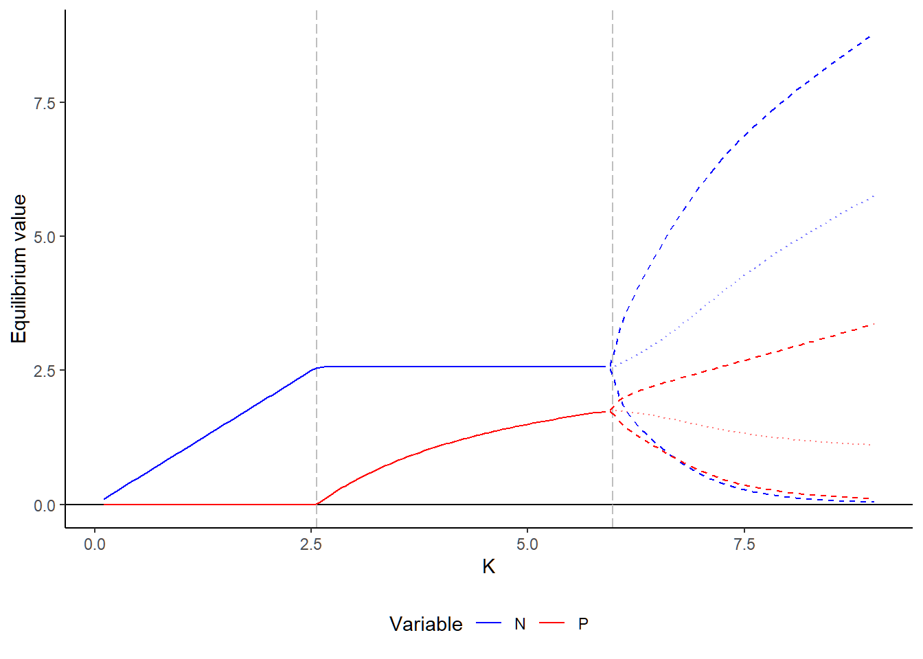 labs(x = "K", y = "Equilibrium value") +