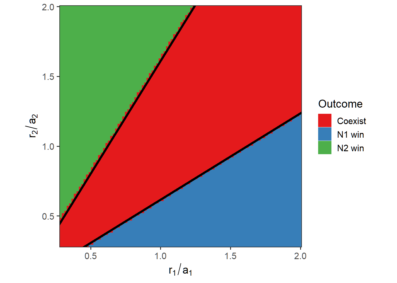 Here, we are going to visualize the outcomes of apparent competition in the \(r_1/a_1\) – \(r_2/a_2\) space: \[\begin{align*} \frac{dN_1}{dt} &= r_1N_1(1-\frac{N_1}{K_1}) - a_1N_1P\\ \frac{dN_2}{dt} &= r_2N_2(1-\frac{N_2}{K_2}) - a_2N_2P\\ \frac{dP}{dt} &= e_1a_1N_1P + e_2a_2N_2P - mP. \end{align*}\] Two prey \(N_1\) and \(N_2\) grow logistically with intrinsic growth rate \(r_1\) and \(r_2\) and carrying capacity \(K_1\) and \(K_2\). Predator \(P\) consumes two prey following Holling type I functional response, with \(a_1\) and \(a_2\) representing the consumption rate of \(N_1\) and \(N_2\) by predator respectively. After consumption, the assimilation rate are \(e_1\) and \(e_2\). The death rate of predator is represented by \(m\).