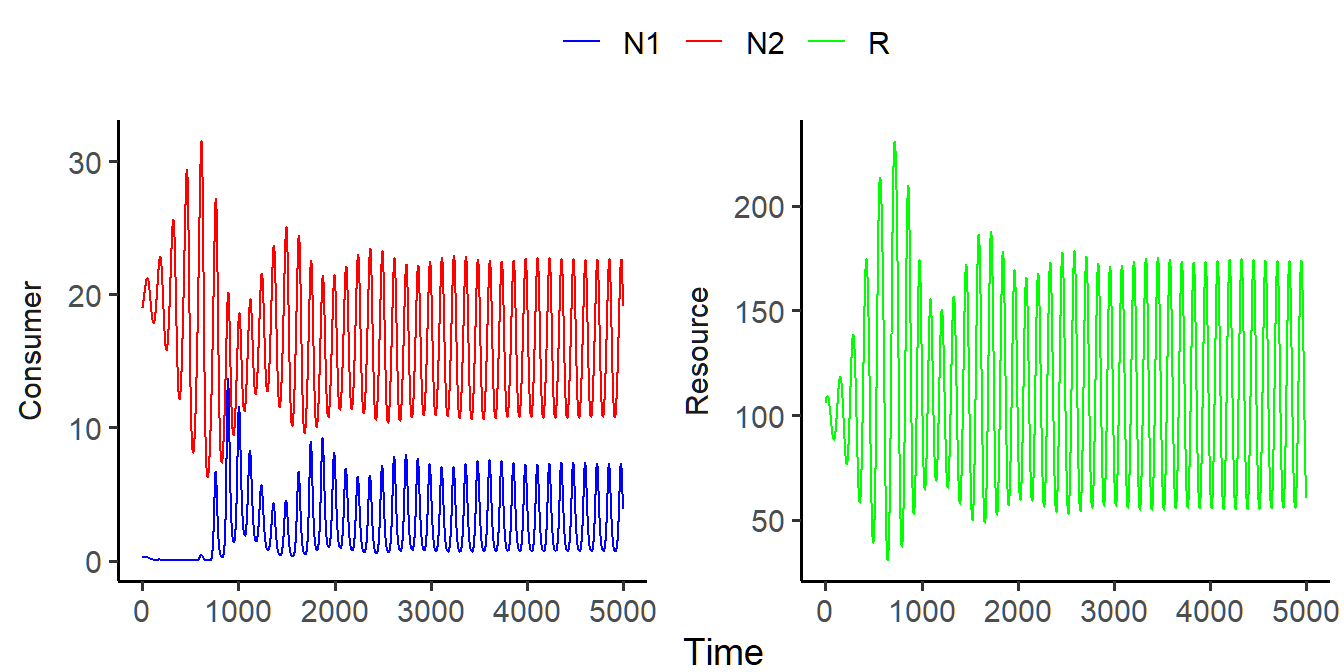 As shown in the figure, the two consumers coexist in a fluctuating manner. In fact, the fluctuating properties generated by the combination of logistically growing resources and different nonlinear functions are critical for the coexistence of \(n\) species on \(k<n\) resources in certain parameter spaces.